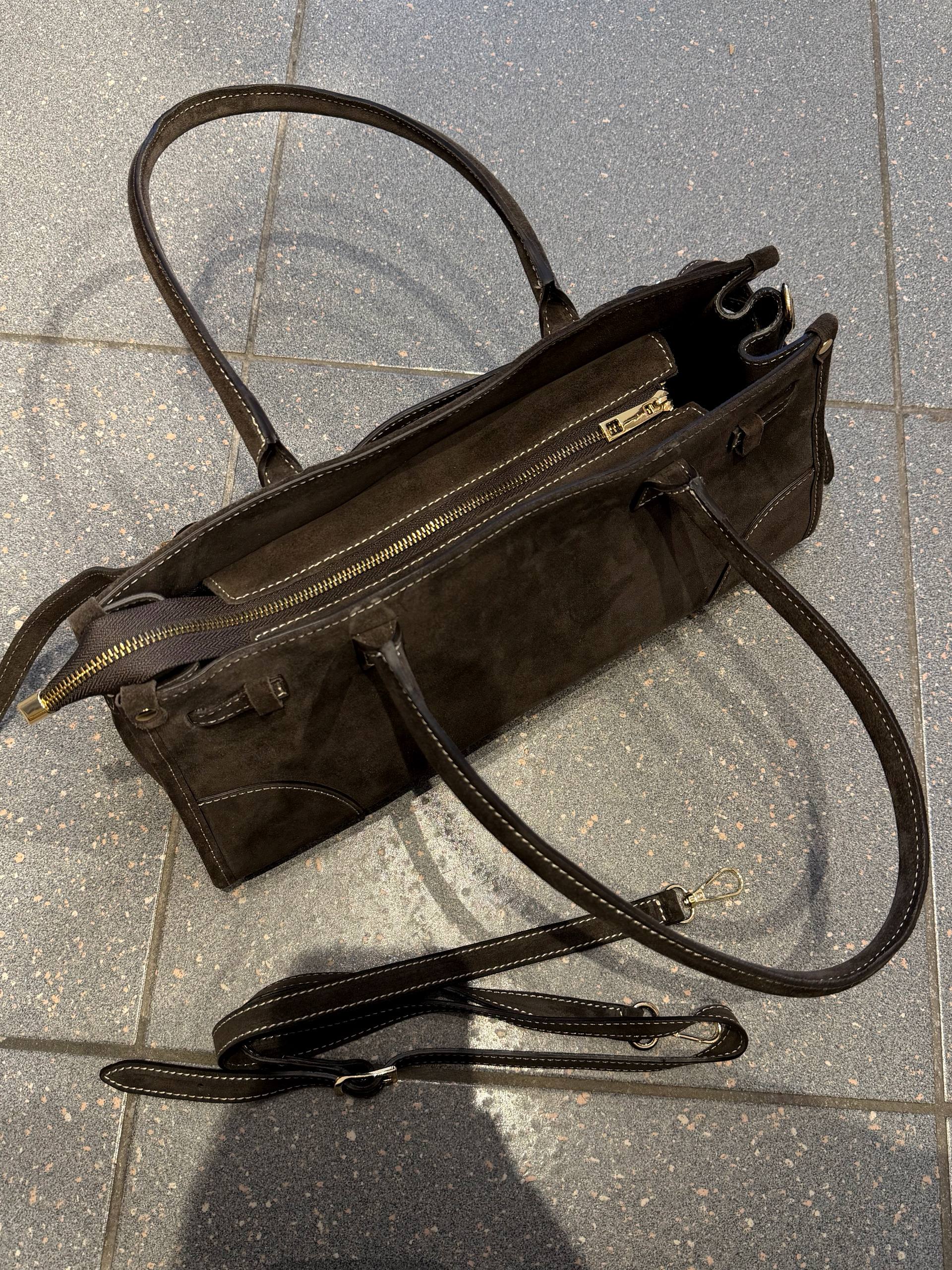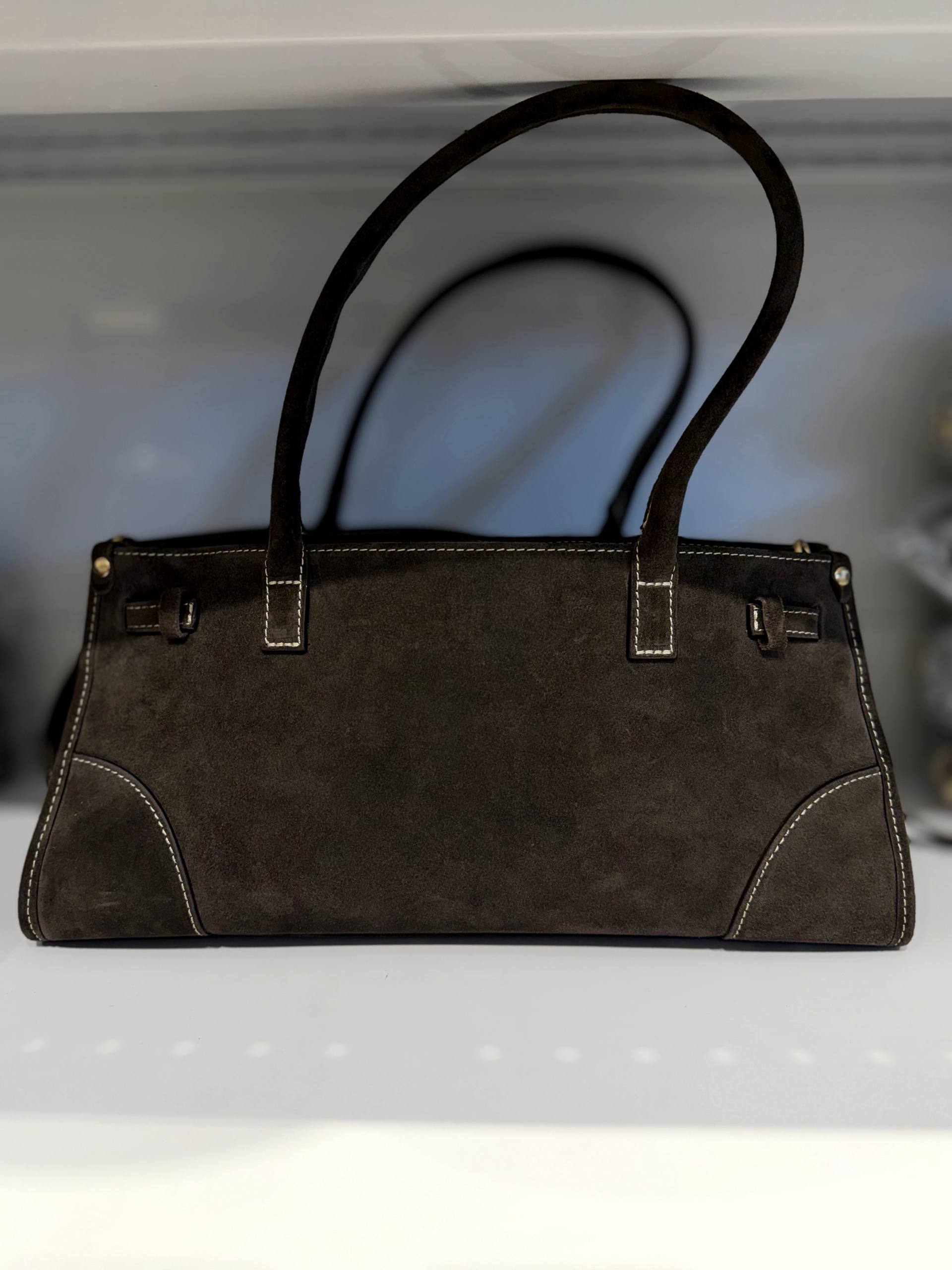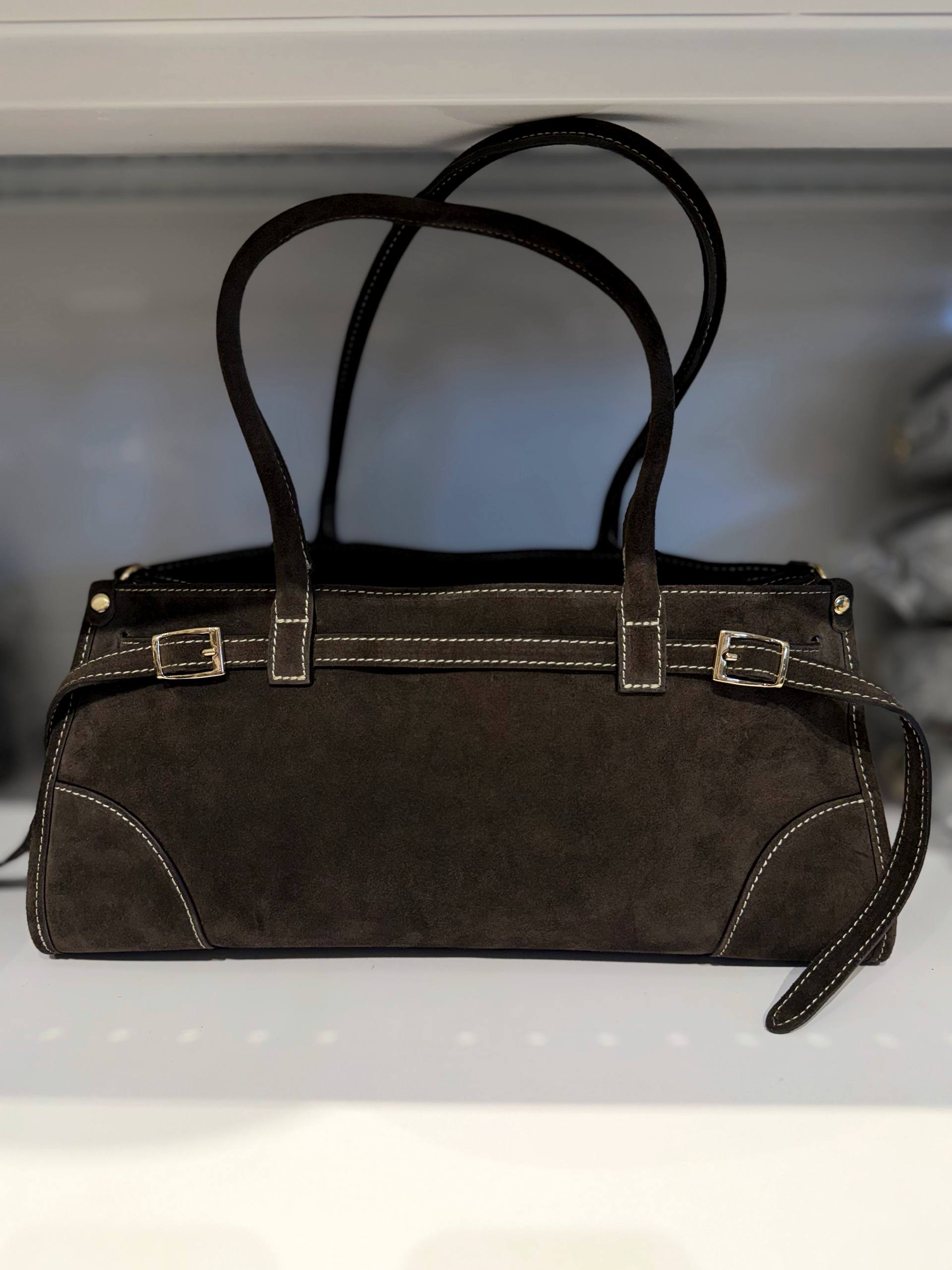 A refined, elongated shoulder bag crafted from supple suede with sleek leather trims. The slim baguette profile tucks neatly under the arm, and a full-length zipper keeps essentials secure. Discreet metal feet protect the base for everyday wear.