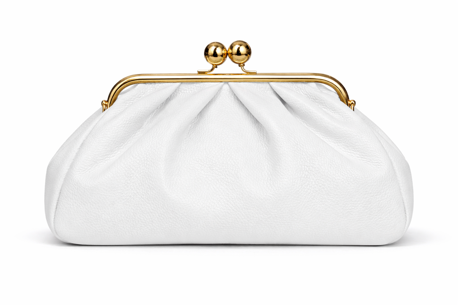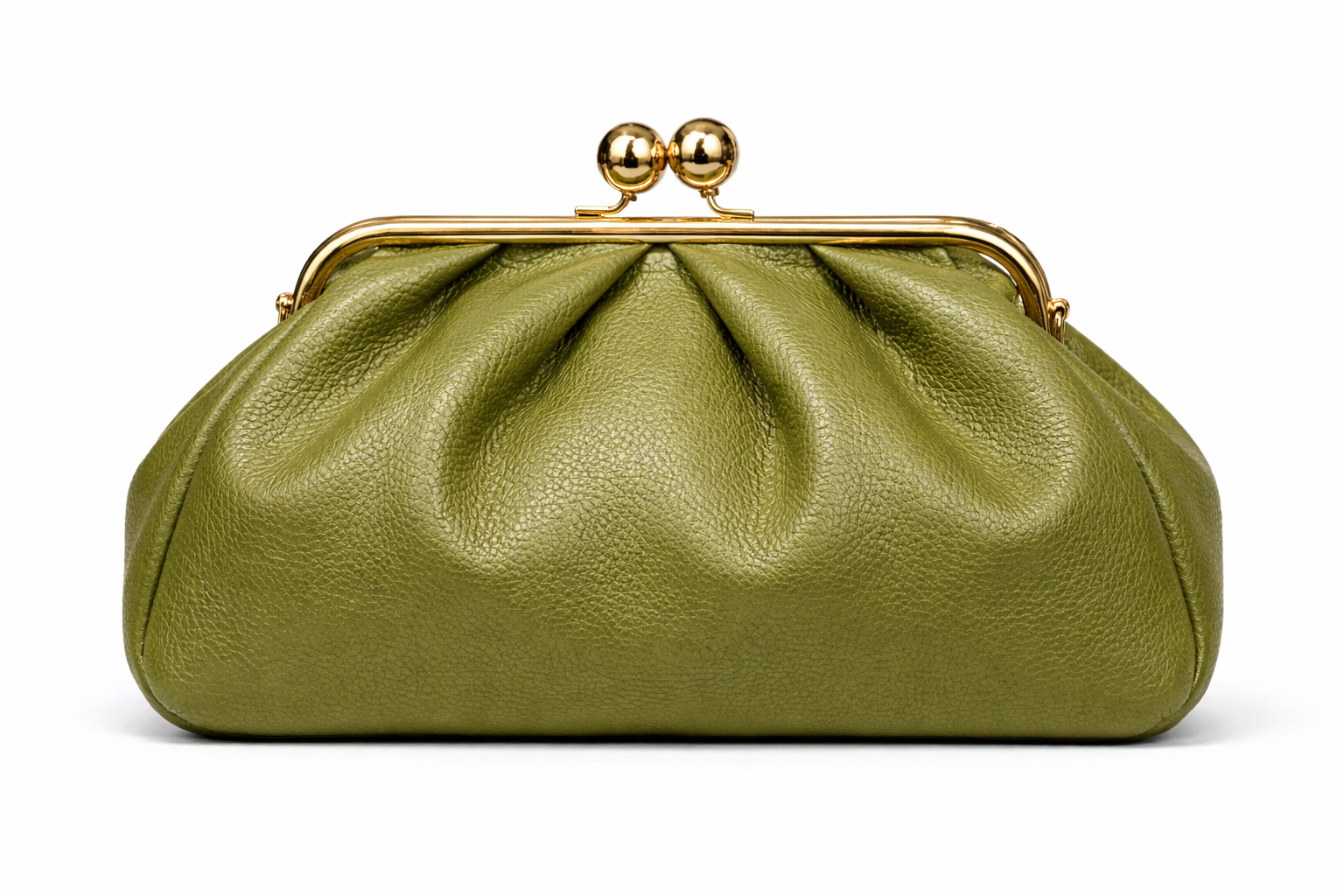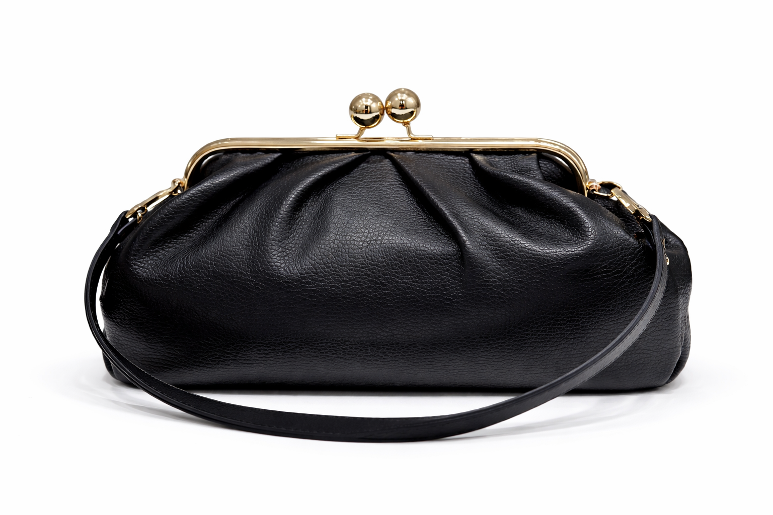 A softly pleated leather bag built on a vintage metal frame with a glossy ball clasp. Fabric-lined interior with a zip pocket, plus a removable strap so you can carry it by hand or on the shoulder — an elegant day-to-night piece