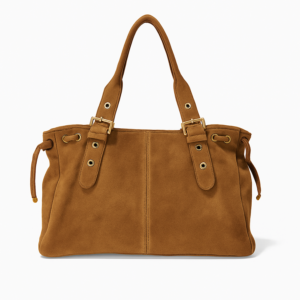 A soft suede tote with adjustable double handles and side ties through metal eyelets. The zip-top opening leads to a roomy, fabric-lined interior that keeps everyday essentials organized without fuss.